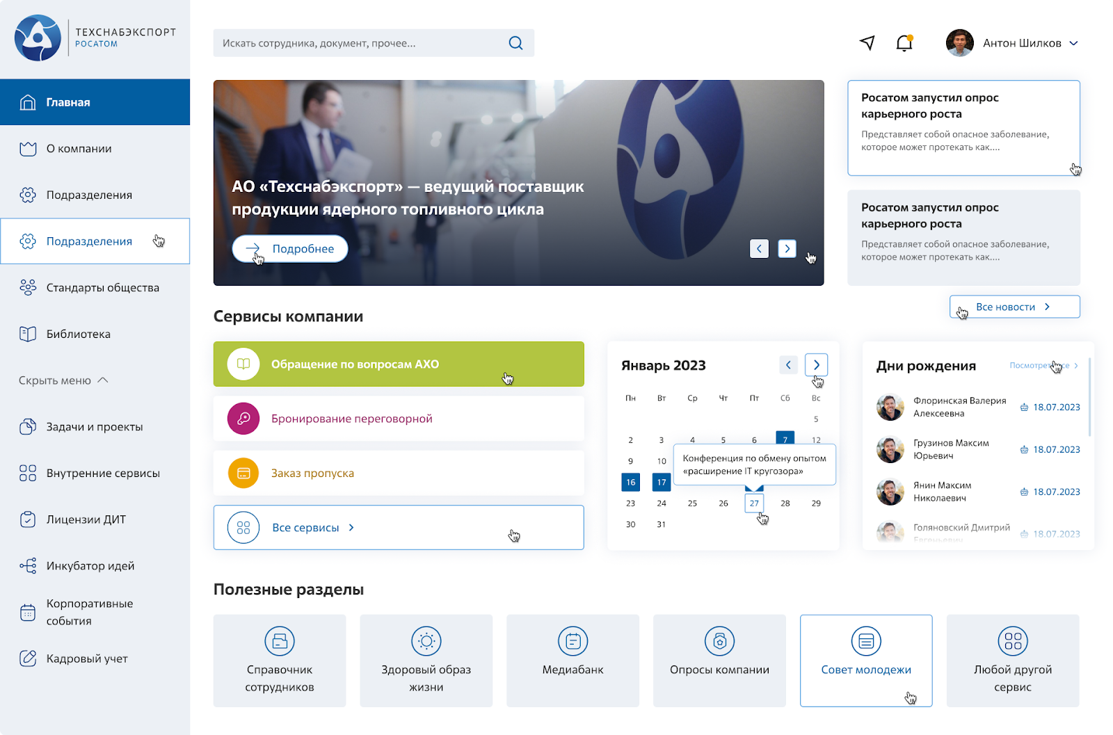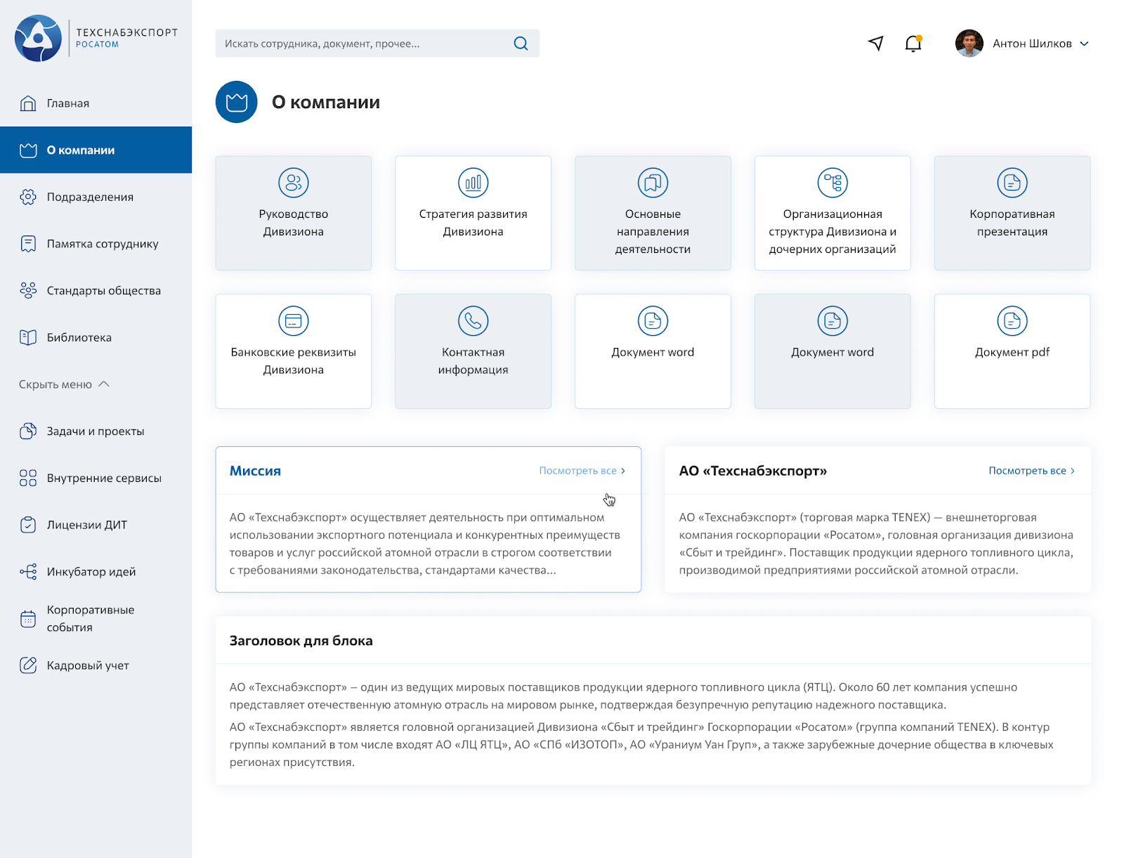 Раздел «О компании». Там пользователь может найти корпоративную презентацию, ознакомиться с организационной структурой, получить контактную информацию и перейти в другие внутренние подразделы.